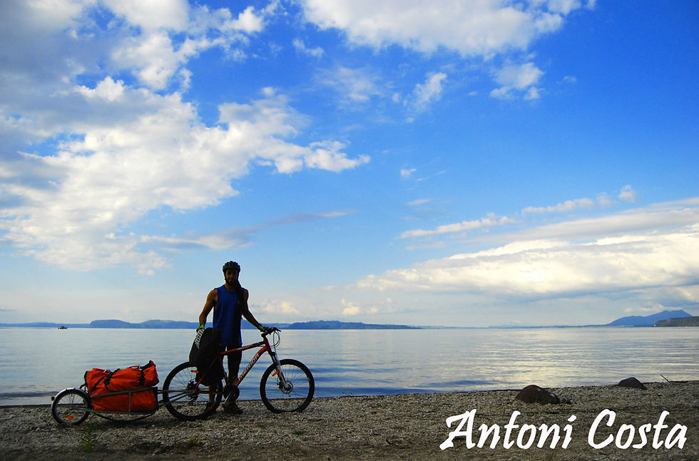 El día amanece espectacular, y tengo un río en frente de la tienda…sí, baño en paños menores. Desayuno con los alemanes, y me dispongo como modelo para Normand, su chica me da conversación para que sea más natural. Como os podéis imaginar se retrasa mi marcha, y decido quedarme más tiempo a la vera del río y marchar por la tarde. Hoy será un día fácil, 35km rodeando el lago Taupo, para aproximarme a la zona de montaña de Tongariro. Compro provisiones en el pueblo de Taupo para pasar unos días en la montaña, y salgo hacia Hatepe. La ruta pega una subida fuerte de 3km, y luego todo bajada hasta el lugar de acampada. En un tramo de la bajada alcanzo mi máxima velocidad hasta hoy, 61km/h, que con el peso del carrito no es jauja, pues tiembla toda la bici y la estructura del carro, y como se parta una pieza, me mato. Duermo en frente del lago Taupo, buena sesión de fotos. Pero no todo podía ser tan bonito, y al montar la tienda, se me parten dos partes de los palos de la tienda, mal asunto, cinta americana es la solución, y a partir de ahora tendré que dormir con la tienda lesionada. Mientras no venga una gran tormenta, todo correcto.