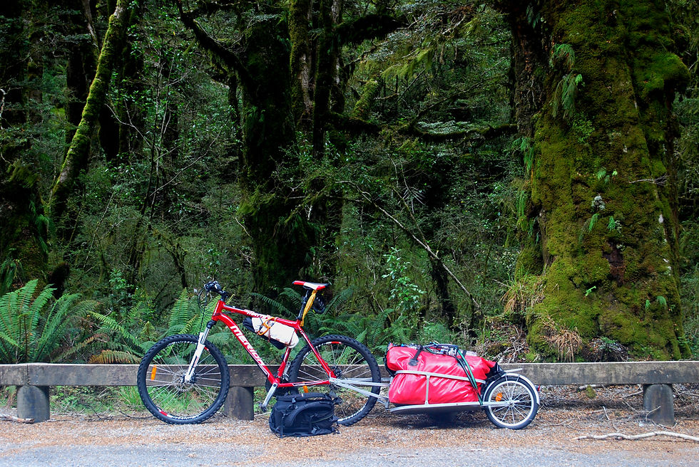 Amanece el día soleado, y yo con ganas de lanzarme a la carretera. La ruta continua similar a la parte final de ayer, constantes subidas y bajadas entre los famosos bosques de lluvia neozelandeses (Rainforest), combinando a su vez con zonas amplias y descubiertas cruzando ríos provenientes del deshielo glaciar de las tierras altas. Es duro pero divertido, además me siento bien y llevo buen ritmo, mientras no vengan rectas interminables, todo vale. Pero nadie dijo que todo iba a ser de color rosa, y en el kilómetro 42, ocurre la catástrofe que hacía ya tiempo se venía anunciando, se parte el eje de la rueda de atrás que sostiene el carrito. Caigo al suelo, sin lastimarme más de la cuenta, menos mal que no iba a gran velocidad. Tirado en la carretera, compruebo los daños, y mal asunto. Eje trasero partido, radios de la rueda trasera doblados, anclaje del carrito doblado, y físicamente, cuatro rasgaduras. Por primera vez en todo el viaje, saco el kit de reparación, mientras, empieza a llover en cantidad. Llevo conmigo un eje trasero de repuesto, y consigo reparar al menos la bicicleta, pero el metal del carrito, es imposible volverlo a colocar en su lugar con mis herramientas, y así es imposible continuar la marcha. El próximo pueblo está a unos 20km, y está lloviendo a cántaros, saco dedo, y a esperar a que alguna furgoneta con espacio pueda llevarme al pueblo de Whataroa. Media hora después, unos amables trabajadores de la zona me acercan hasta el pueblo, donde consigo encontrar un mecánico que me dejará todo listo para poder continuar. Acabo el día haciendo los últimos 20km bajo la lluvia hasta el camping del lago Mapourika, estoy empapado, no ha sido un buen día, pero sienta bien llegar a buen puerto por muchas situaciones adversas que uno encuentra en el camino. En fin, esto también forma parte de la aventura del viajero.