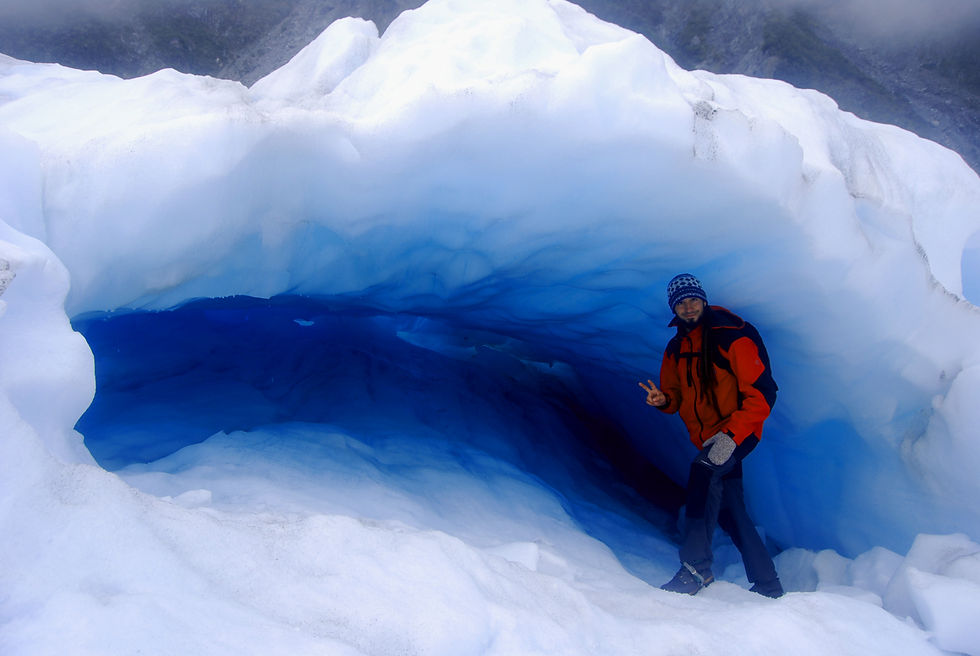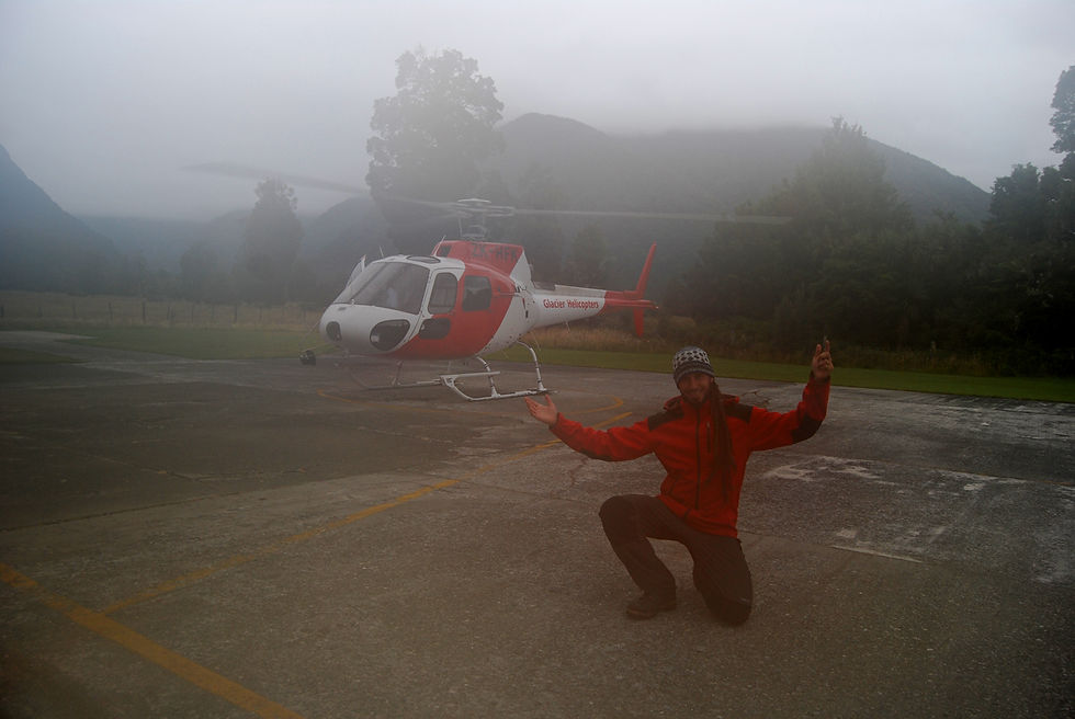 Nos despertamos temprano para ir hacia el Lake Matheson (12km), dónde se divisa una imagen muy conocida, el reflejo del Mt Cook (3754m) y el Mt Tasman (3498m) sobre el lago, y la mejor hora para verlo es al amanecer. La imagen es tan perfecta, que incluso en la realidad, parece retocada por photoshop, impresionante. De vuelta al pueblo, la idea es ya salir de la zona de los glaciares y continuar con una etapa larga, pero a través de Lionel, el argentino de la casa, conozco a Francesca, de Costa Rica, que trabaja en una compañía de guías de montaña y vuelos en helicóptero, y me comenta que hay la posibilidad de volar gratis en helicóptero hacia el glaciar si queda alguna plaza libre, gracias a ella claro, y éste tipo de oportunidades no hay que dejarlas escapar, porque uno no vuela en helicóptero todos los días, así que decido quedarme una noche más en la “casa de acogida latina” para probar suerte. La pareja francesa, Sebastien y Letitia, deciden continuar la marcha, pero espero encontrarles más adelante porque me apetecía mucho continuar la ruta con ellos. A las 3pm, queda plaza libre para el heli-hike, brutal, ya se me han puesto los pelos de punta. Nos dan cuatro explicaciones rápidas y veo el helicóptero llegar, que sensación, ¡voy a volar en helicóptero! Me subo, me pongo los cascos, y a disfrutar. Unos 10 minutos de vuelo hasta llegar a la mitad del glaciar Fox, el piloto haciendo virguerías y yo alucinando, una pasada. Aterrizamos en el glaciar y nos damos un paseo por el glaciar de 2h, con Mandy, nuestra guía. Voy con dos japonesas, así que foto cada 10m. La vuelta al pueblo en helicóptero igual de espectacular. Muy feliz por poder tachar una cosa más de la enorme lista que tengo de cosas por hacer en ésta vida, gracias Francesca. Por la noche, a cocinar para los latinos, que también tengo mucho que agradecerles. Mañana continuaré con la ruta con una gran sonrisa de oreja a oreja.