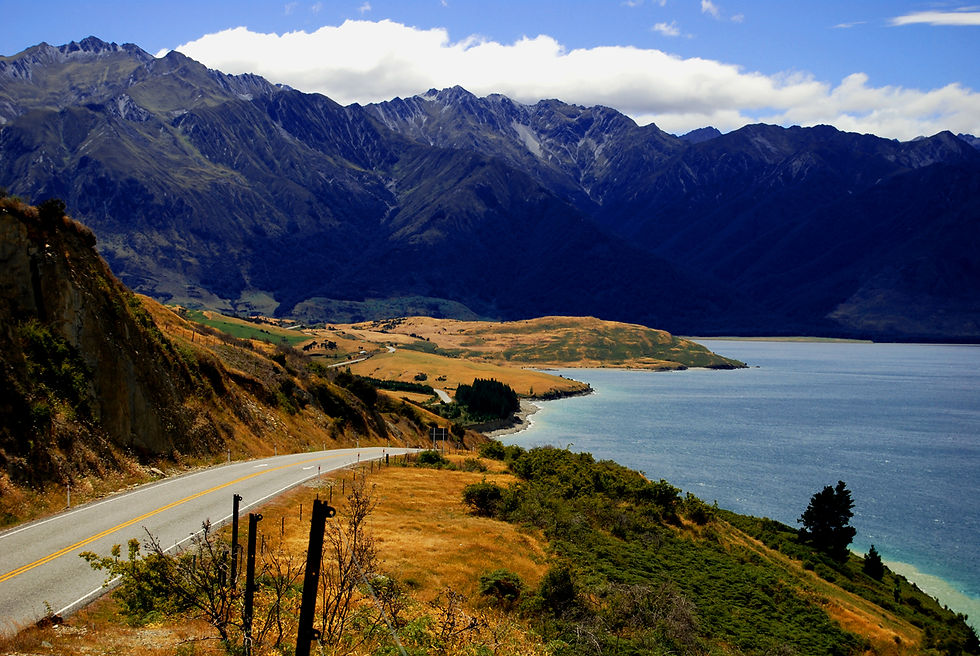 Soleado, viento a favor, bello paisaje, día perfecto. Arranco la ruta por el otro lado de las montañas, hacia Wanaka, y el desnivel general va perdiendo altura durante los 70km, así que toda la ruta a buena velocidad. Nada más empezar, ya empiezo a divisar el inicio del lago Wanaka, y la carretera fluye costeando el lago en todo momento, precioso, hasta cruzar una cordillera hacia el este, y encontrarme con el lago Hawea, otro golpe de magia para mis ojos, donde la carretera también costea el lago hasta casi llegar a Wanaka. Hoy he exprimido la bici al máximo, el carrito temblando, las piernas funcionaban solas, he aquí una prueba del influyente factor psicológico sobre el rendimiento físico, pues el simple hecho que el paisaje acompañara en todo momento, hace no pensar en el cansancio, o en la solitud del viaje, o en la dureza de la carretera…Hoy he disfrutado de verdad, ha sido un día de aquellos por los que vale la pena viajar. Al llegar, baño en el agua helada del lago Wanaka, mientras me entretengo viendo el triatlón Ironman Wanaka Challenge, muy buena organización, estos kiwis se lo montan bien, algún día habrá que hacer uno. Me quedo con el último en cruzar meta, 3,8km nado, 180km bici, 42km carrera, tiempo utilizado 18h 30’ llegando a las 00:30 noche, 75 años, emocionante, intenso, sobrecogedor.