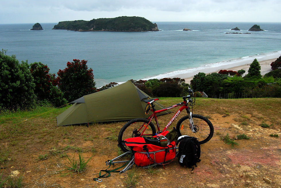 Continuando por la misma carretera que el día anterior acompañado por viento y lluvia. Subidas fuertes es la rutina del día, y las bajadas no son lindas como esperaba, cosa de los altiplanos de la zona. Consigo llegar hasta Whitianga, donde cojo un mini ferry para cruzar 200m de mar, y así poder pedalear por la costa hasta llegar a Hahei. Desde ahí, 1km más de pura subida quemapiernas, y llego al párking de Cathedral’s Cove, una playa muy conocida y transitada por los turistas. Dejo el carricoche a buen recaudo, y bajo por el sendero que lleva a la playa solo con la bici, y que bien sienta un poco de mountain bike sin lastre. El lugar es muy bonito, una playa paradisíaca con unas extrañas formaciones rocosas, aunque me cuesta encontrar el momento para hacer una foto sin ningún turista, de esas que a mí me gustan. Subo de vuelta al parking, recojo mis bártulos, y busco un lugar para acampar. Encuentro una balconada con vistas a la playa de Hahei, apartado, perfecto para pasar la noche. Cuatro fotos, cena y a dormir, que mañana toca aumentar kilómetros.